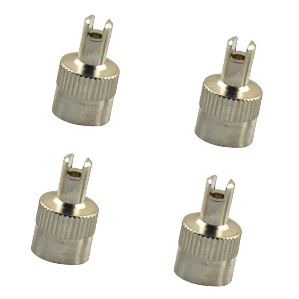 Set of chrome valve caps to keep valves free of dirt and grit. Each cap includes a valve removal tool on top.