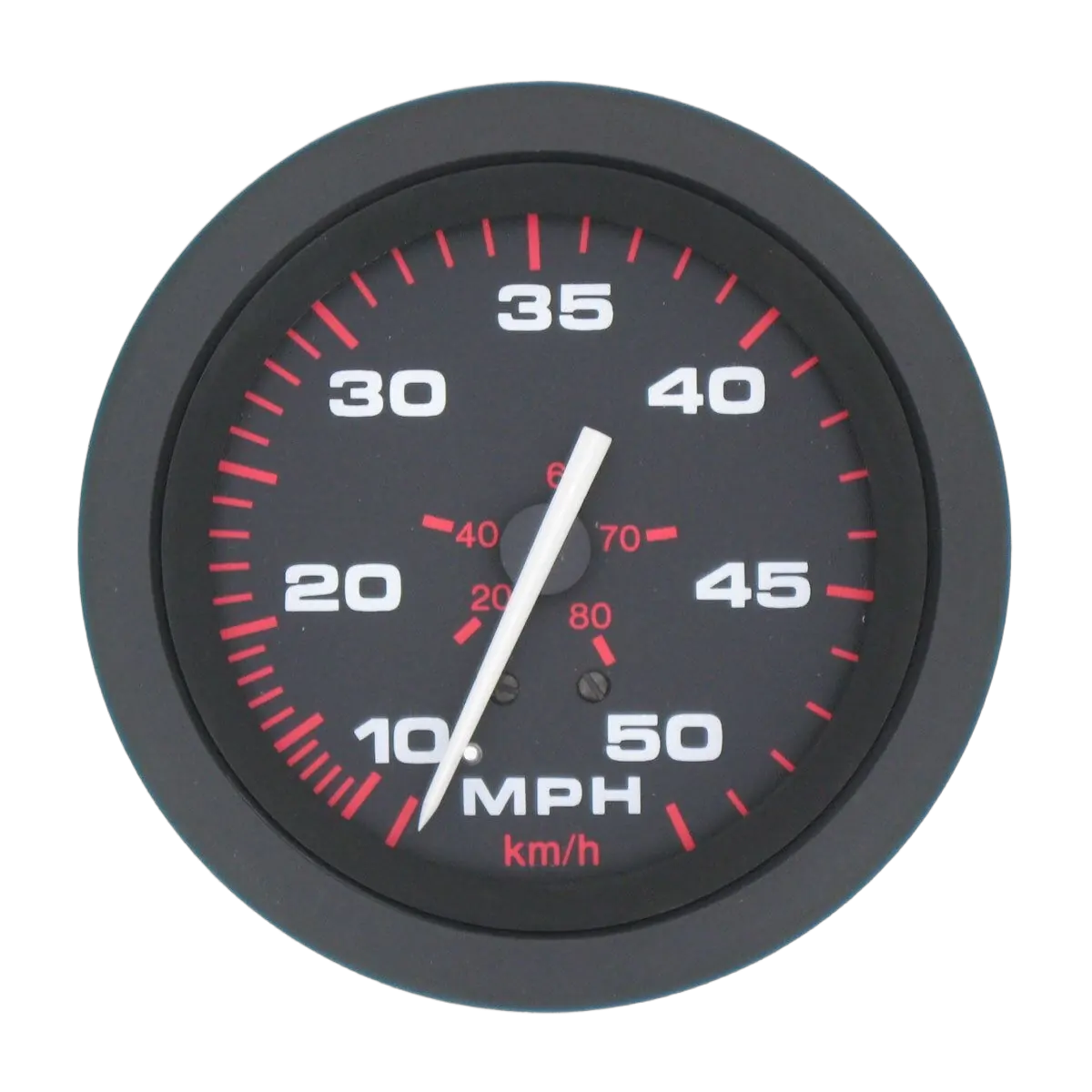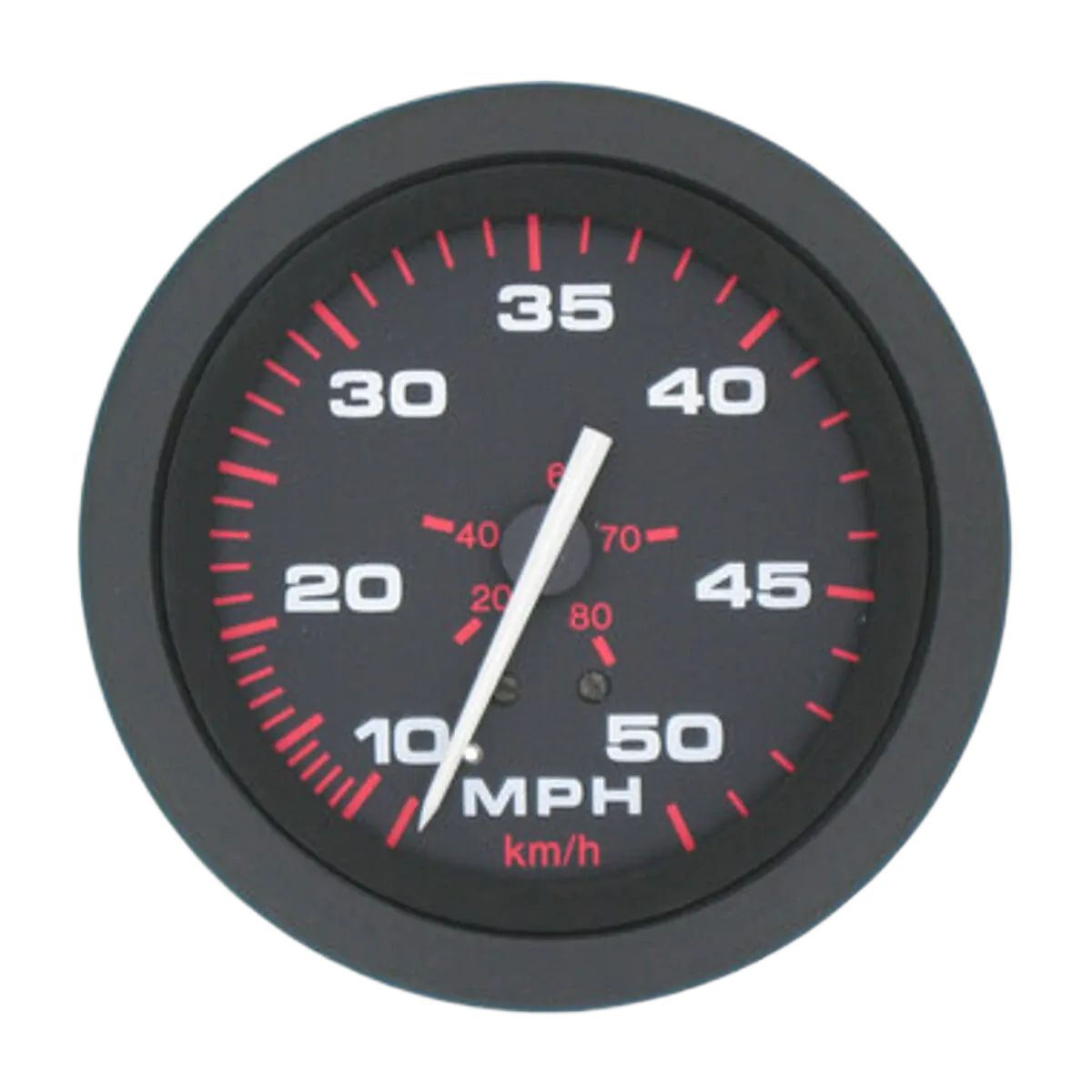 Features Very low profile black bezel follows the curve of the lens to eliminate any water 'trapping' Red and white graphics on a black dial background Through dial and perimeter lighting is provided for night visibility Domed convex glass is scratch resistant Pointers are white with a black hub Shielded to prevent magnetic interference Silicone dampened Suitable for 24 volt application with the addition of a drop resistor (112394, 112396\n\n[table id=2085 /]\n\n[table id=2084 /]\n\nAccessories\n112394 Drop resistor suit 75mm gauge\n112396 Drop resistor suit 50mm gauge\n112390 24 volt bulb