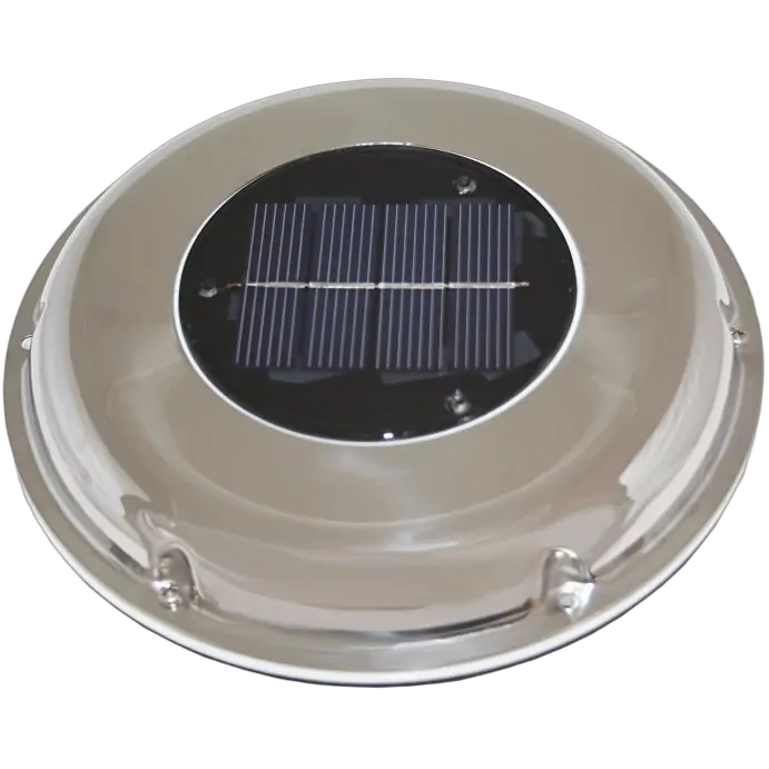 Low profile, weatherproof, solar powered vent with stainless steel housing. Extracts up to 900 cubic feet of air per hour in bright sunlight conditions.