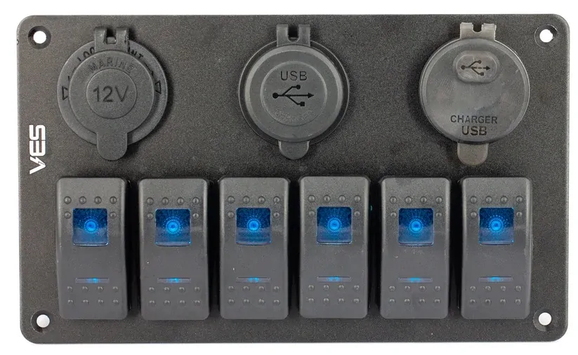 6 Blue Rocker Switches + Marine Socket + USB X 2 - 2.4amp Outlets + Voltmeter USB 3.0 Quick Charge on/off switch