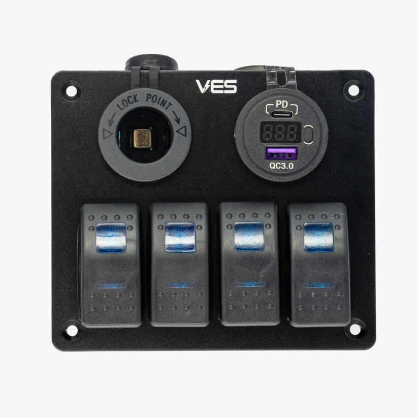 VES Switch Panel - 4 Switches + Marine Socket + USB-C Voltmeter and USB Quick Charge