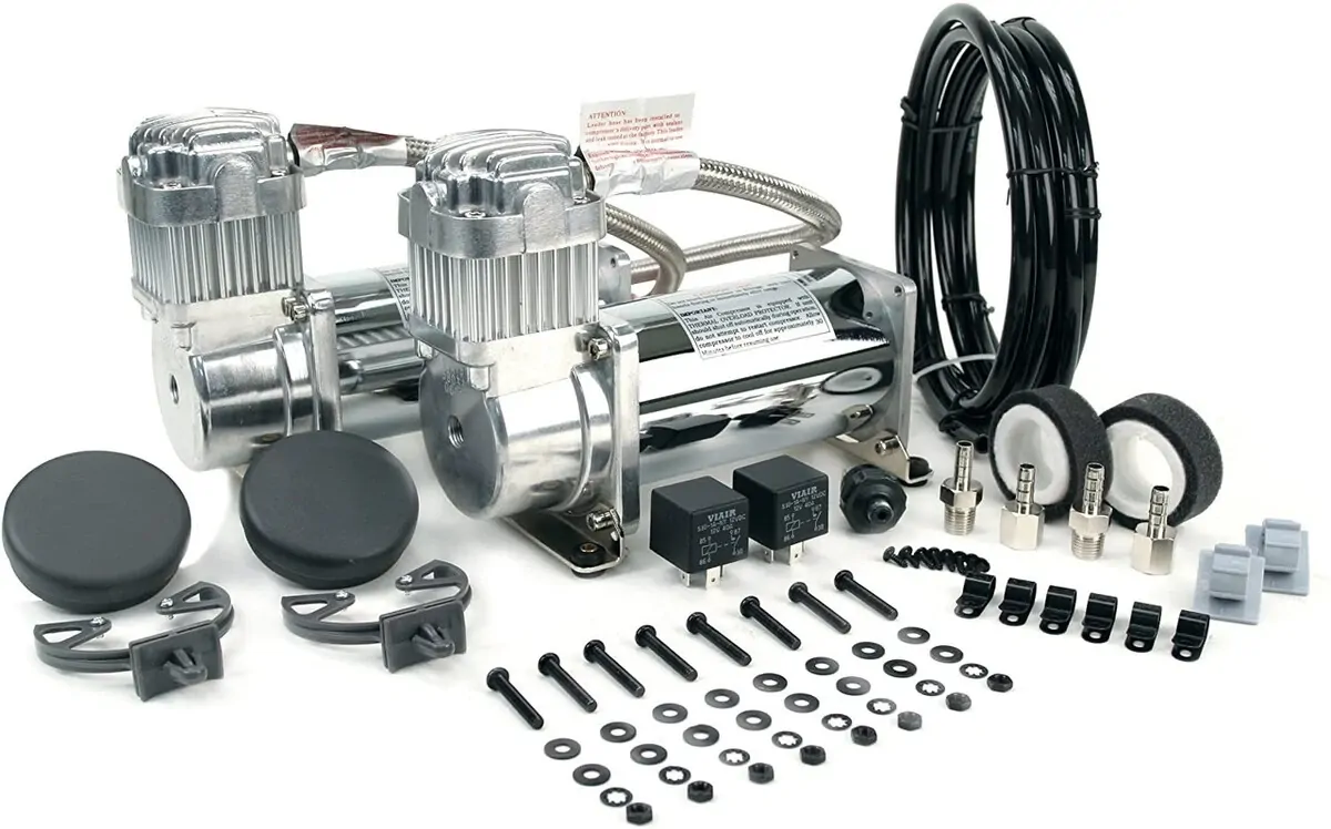 The ViAir 400C Dual Performance Value Pack is our fastest filling, highest CFM air compressor system, This kit is perfect for industrial use, air horns, off-road applications, and a great addition to any air suspension kit. The 400C Dual Performance Value Pack includes two 12-volt Chrome VIAIR 400C air compressors, two heavy duty 40-amp relays and an 110 PSI cut-on, 145 PSI cut-off pressure switch. Each Dual Performance Value Pack comes with remote mount filter assemblies and mounting hardware.