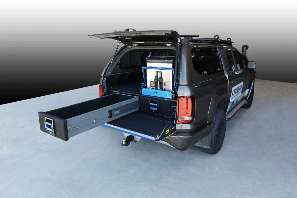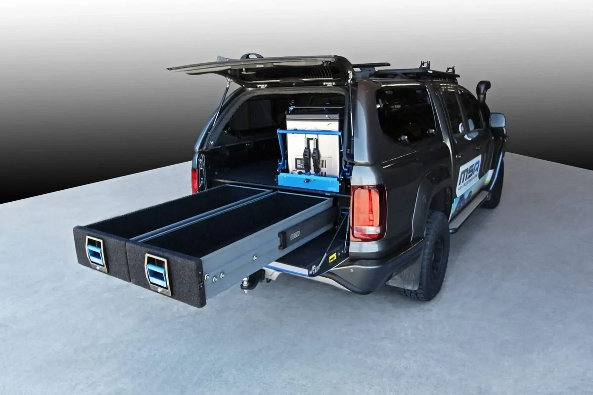 One of the lightest drawer systems ever made, the ADR Crash Test Certified MSA 4X4 Explorer Aluminium Storage Drawer System boasts more storage space than most other systems with the same outside dimensions! Patented “Pro-Glide technology smoothly handles up to 250kg per pair of drawers providing smooth opening under heavy loads as well as 100% drawer extension and access. The entire drawer comes out further than the frame! No hard to reach items in our drawers and no unpacking of contents to reach items at the back!