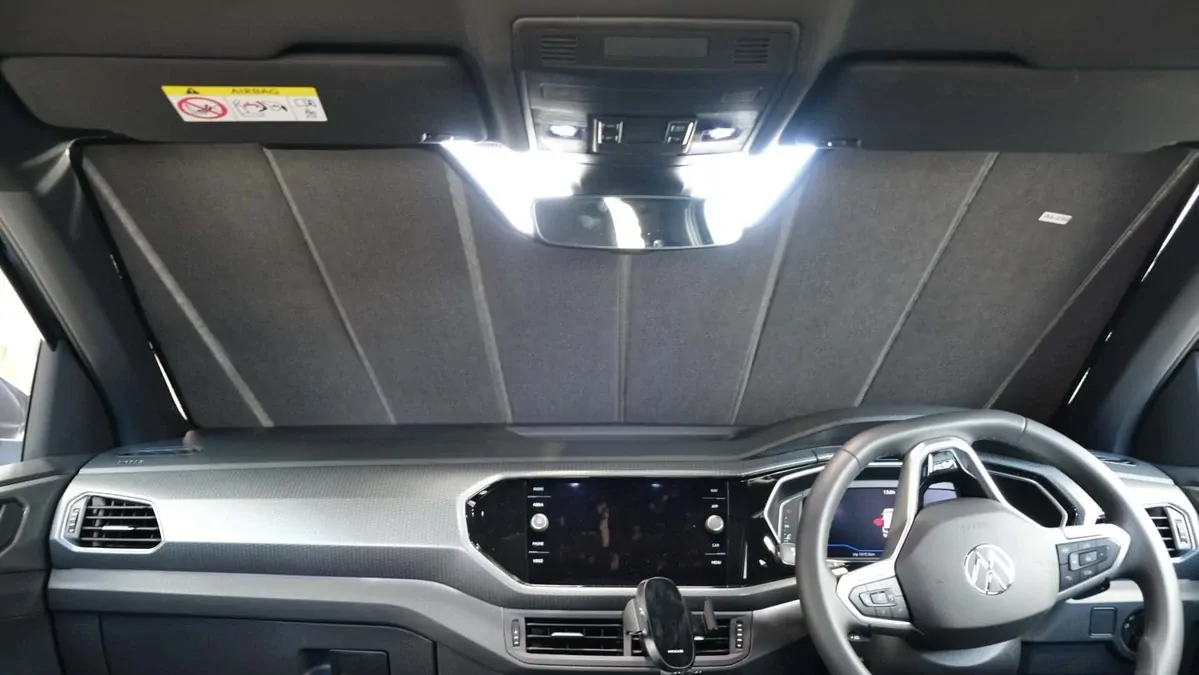 Note: Our custom sun shades block out a significant amount of light and UV rays that enter from the front windscreen, however due to the angle of the front windscreen and additional sensors or different mirror shapes/sizes available for different models, there may be slight gaps around your rear-view mirror or sides to allow the sun shade to fit.
