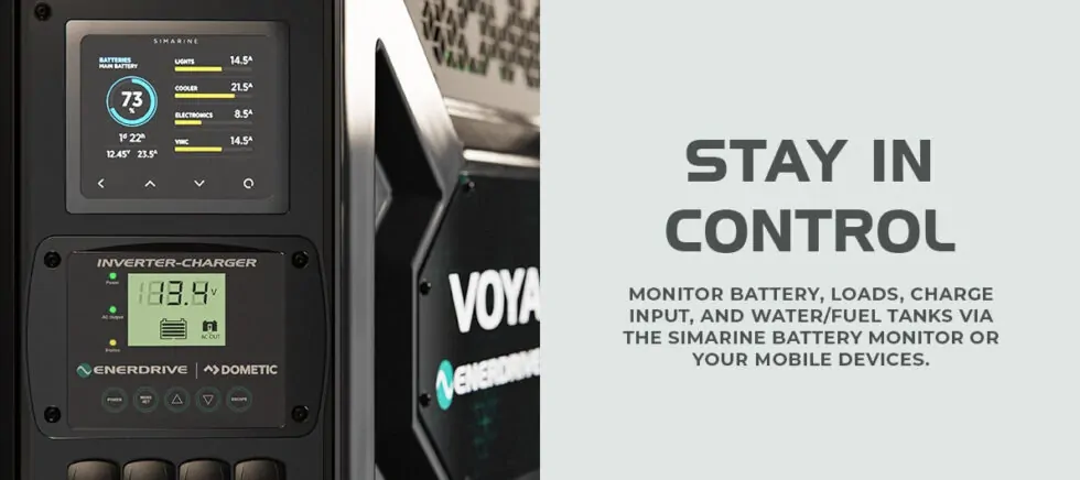 Monitor battery, loads, charge input, and water/fuel tanks via the Simarine battery monitor or your mobile devices
