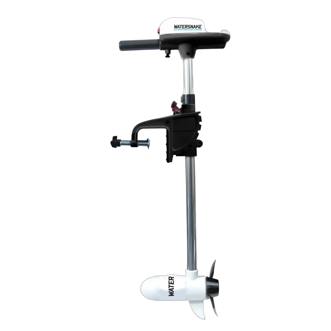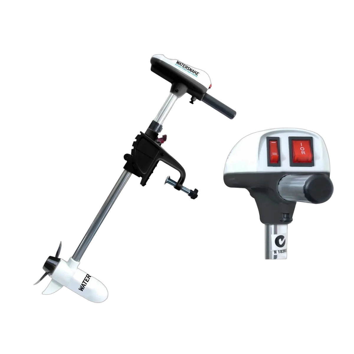 PERFECT FOR KAYAKS! Watersnake Asp Motors are the smallest of all Watersnake motors. They're designed especially for kayaks and small canoes and have an adjustable transom-mount fitting for easy attachment. There is a high and low speed control, a forward and reverse switch, and it features an anti-impact clip system in the mount. The two-blade propeller is a weedless design. It's a lightweight motor offering the ultimate in portability and can be used in both saltwater and freshwater.