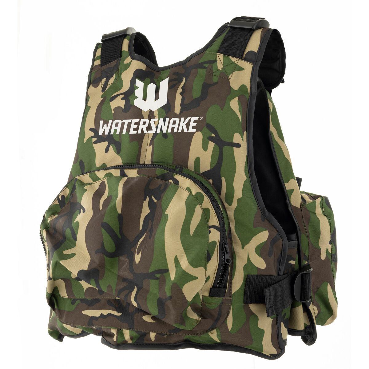 The Watersnake Prowler includes multiple zip pockets on the front and back for storing fishing tackle, tools, and personal items. It also features easy-to-adjust straps, durable buckles, tough zippers, and a camo print design that enhances the stealth factor by blending into the surroundings.