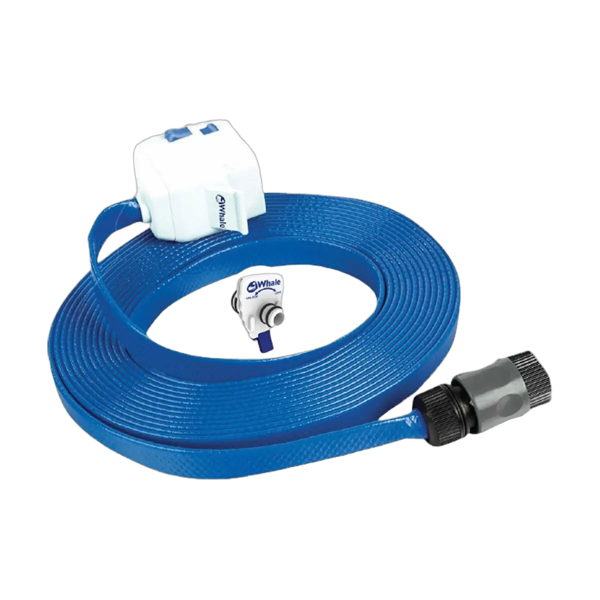 Allows connection from mains water supply to Whale Watermaster Exterior sockets. The easy fit plug regulates water pressure to 1.5bar for a reliable continuous supply of water. Lay flat hose allows for easy storage. 130214 adapter allows use with Truma Ultraflow housings.