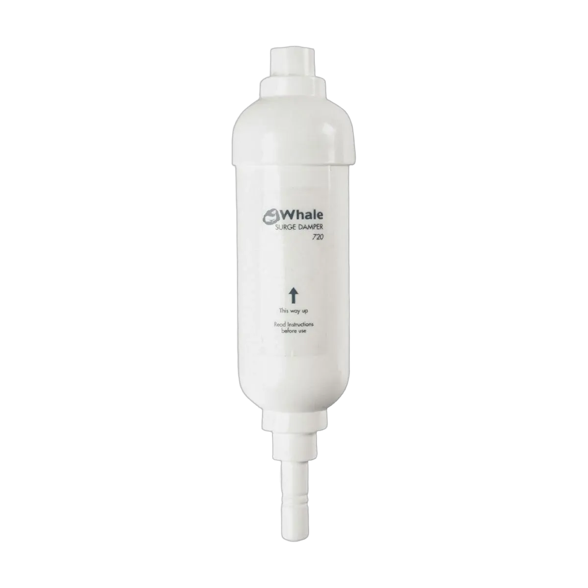Prevents water hammer and also reduces switch hunting. Designed for pressurised systems using the Whale quick connect systems. The surge damper should be mount in a vertical position immediately after the pump discharge side. Connection is via a Whale Quick Connect Stem. Unit is completely seaLED requiring no servicing. Supplied complete with mounting clips.\n\n[table id=1551 /]