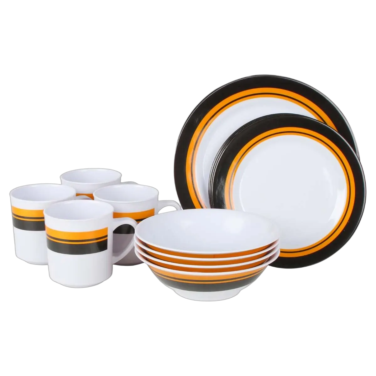 The 16-piece melamine dinner set, a versatile and stylish addition to your tableware collection. Boasting bright and captivating colours of orange, black, and white, this set is designed to infuse your dining experience with a touch of modern elegance and flair.