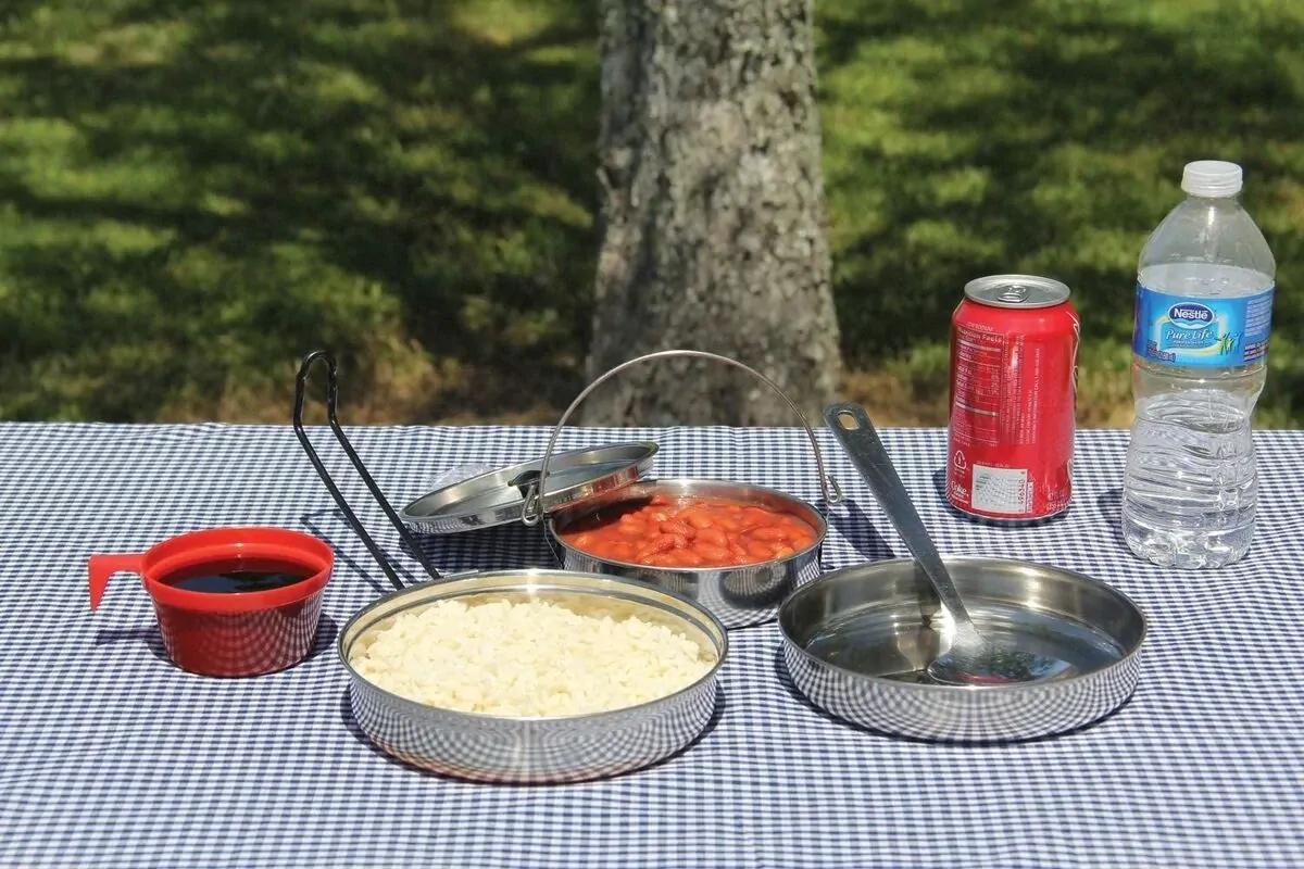 Stainless steel 1 person piece mess kit with nesting design for easy storage.