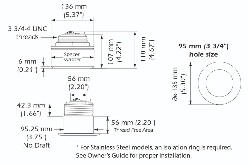 | Hole Diameter | Fiberglass or wood hull—95 mm or 3-3/4" |