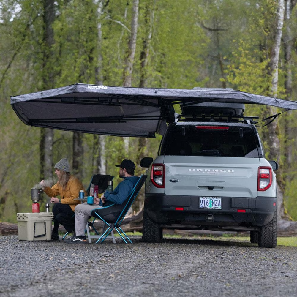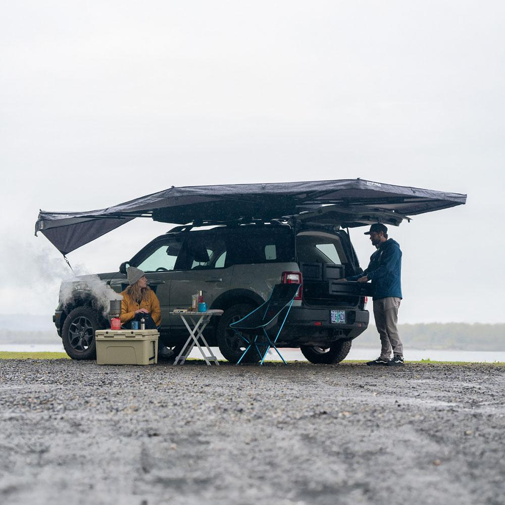 Taking It Easy just got easier with the OverNOut 270 XL. Built with strength and ease in mind, this freestanding beauty protects you from both rain and sun with 12.26 sqm of coverage. Installation is quick and easy with integrated T-slot attachments to connect to your favorite T-slot crossbar or platform. So, whether you're looking to chill at the campsite or be the center of attention at the next outdoor event, the OverNOut 270 XL has got you covered literally.