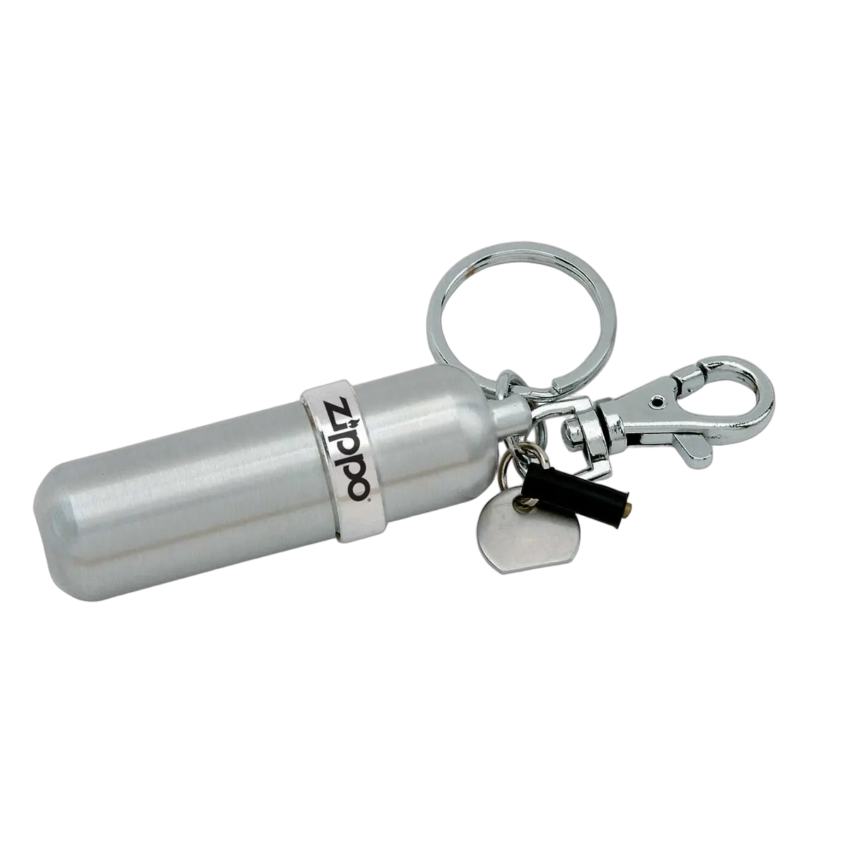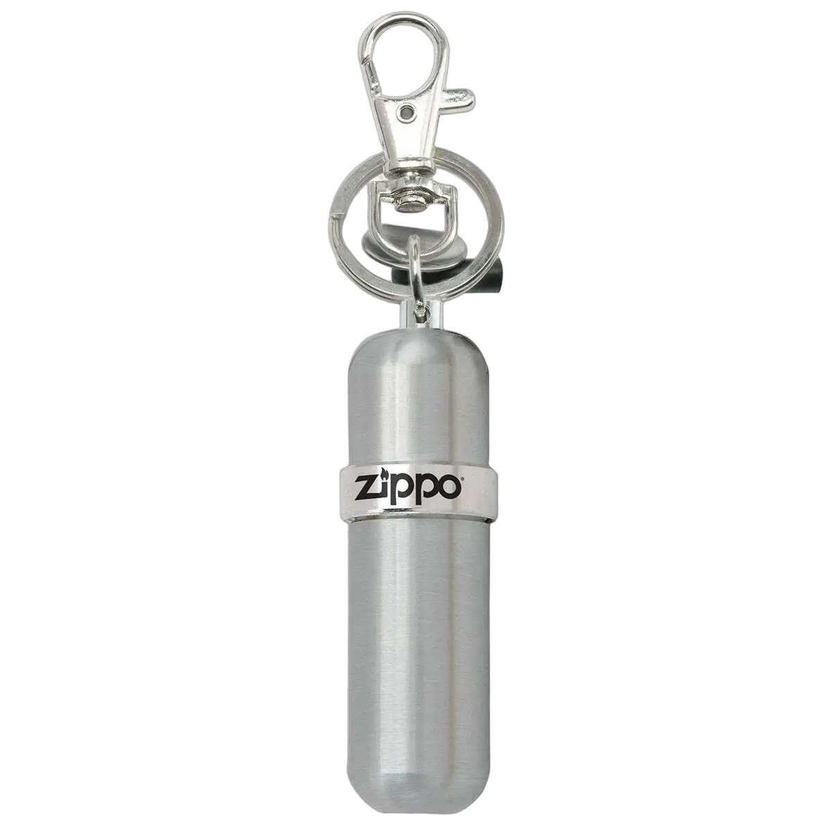 Take along an extra refill of Zippo premium lighter fluid. Reusable personal-sized aluminum canister holds enough fuel to fill one Zippo windproof lighter or a 6 hour fill on a Hand Warmer. Includes swivel snap fastener, split ring for keys, disk to tighten and loosen flint screw, and rubber storage sleeve for two extra Zippo flints.
