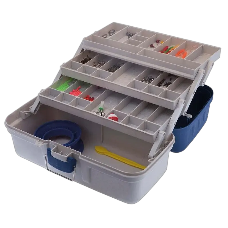 • The Jarvis Walker 500 Piece Tackle Box Kit uses a three-tray tackle box.
